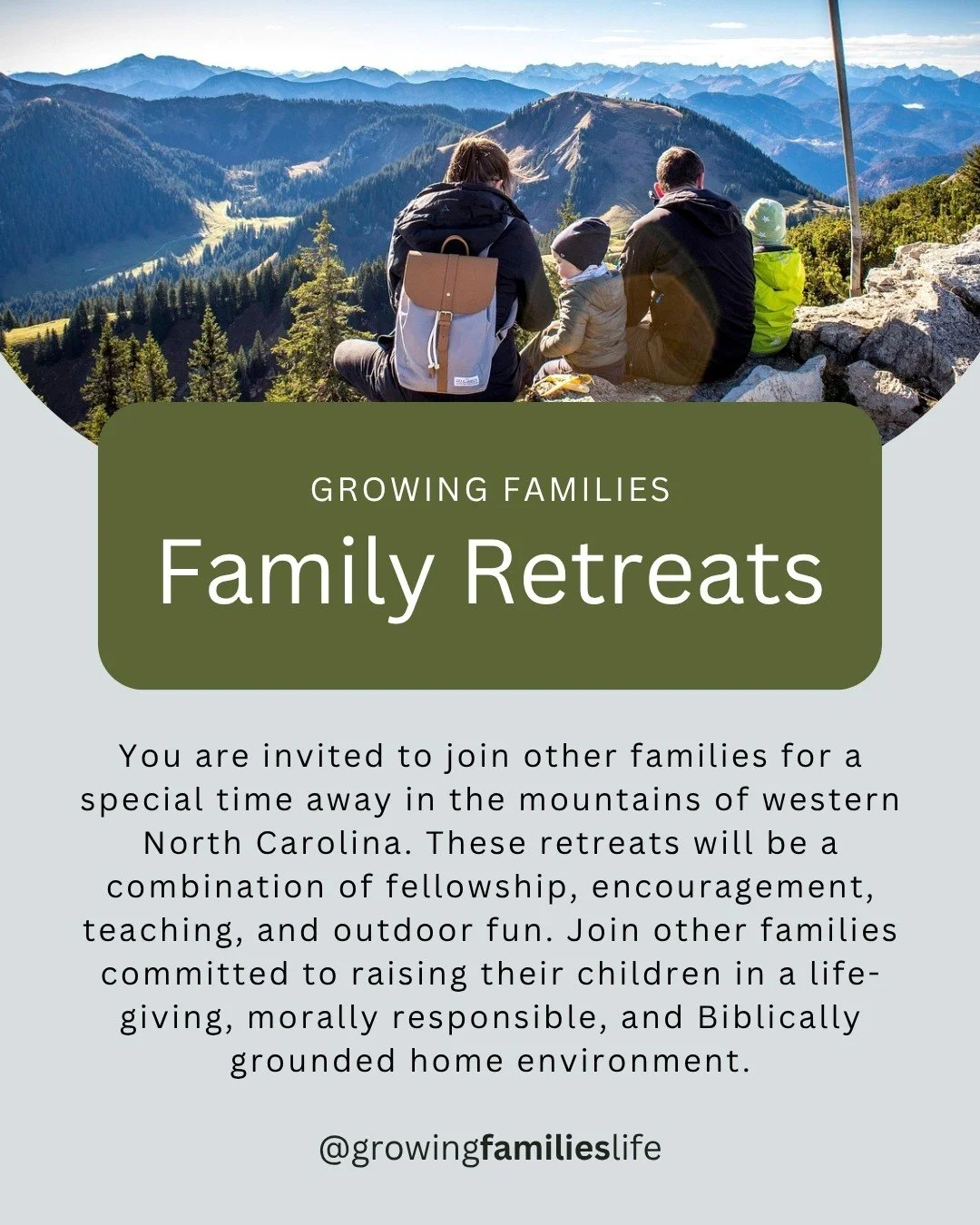 If you would like to receive information about upcoming Family Retreats, please email CustomerService@GrowingFamilies.Life